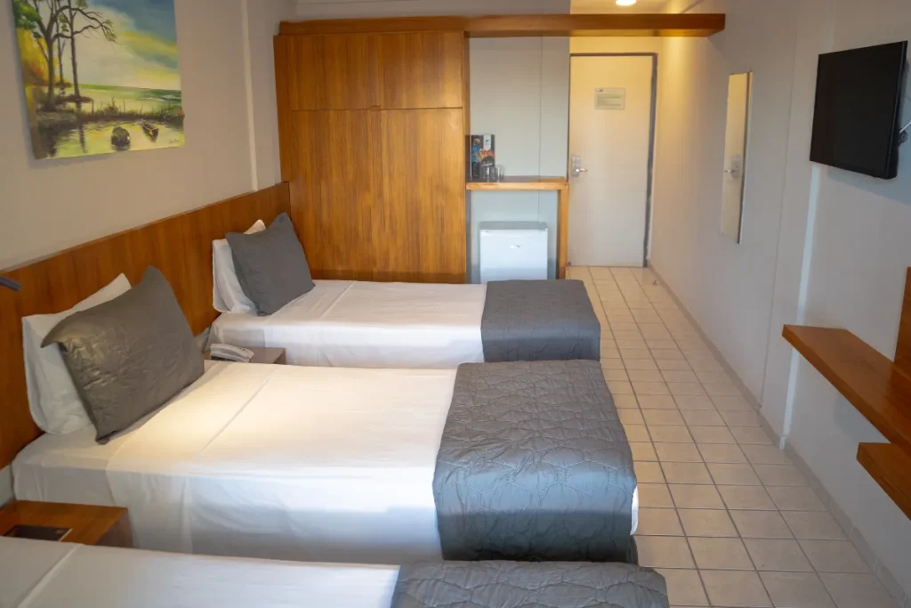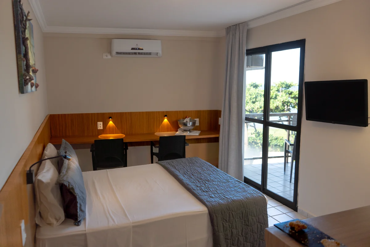 Todas são equipadas com Ar-condicionado Splint, TV Smart de 32 polegadas, Frigobar, Cofre Digital, Armário, Telefone, Secador de Cabelo e Banheiro Privativo com Amenities.