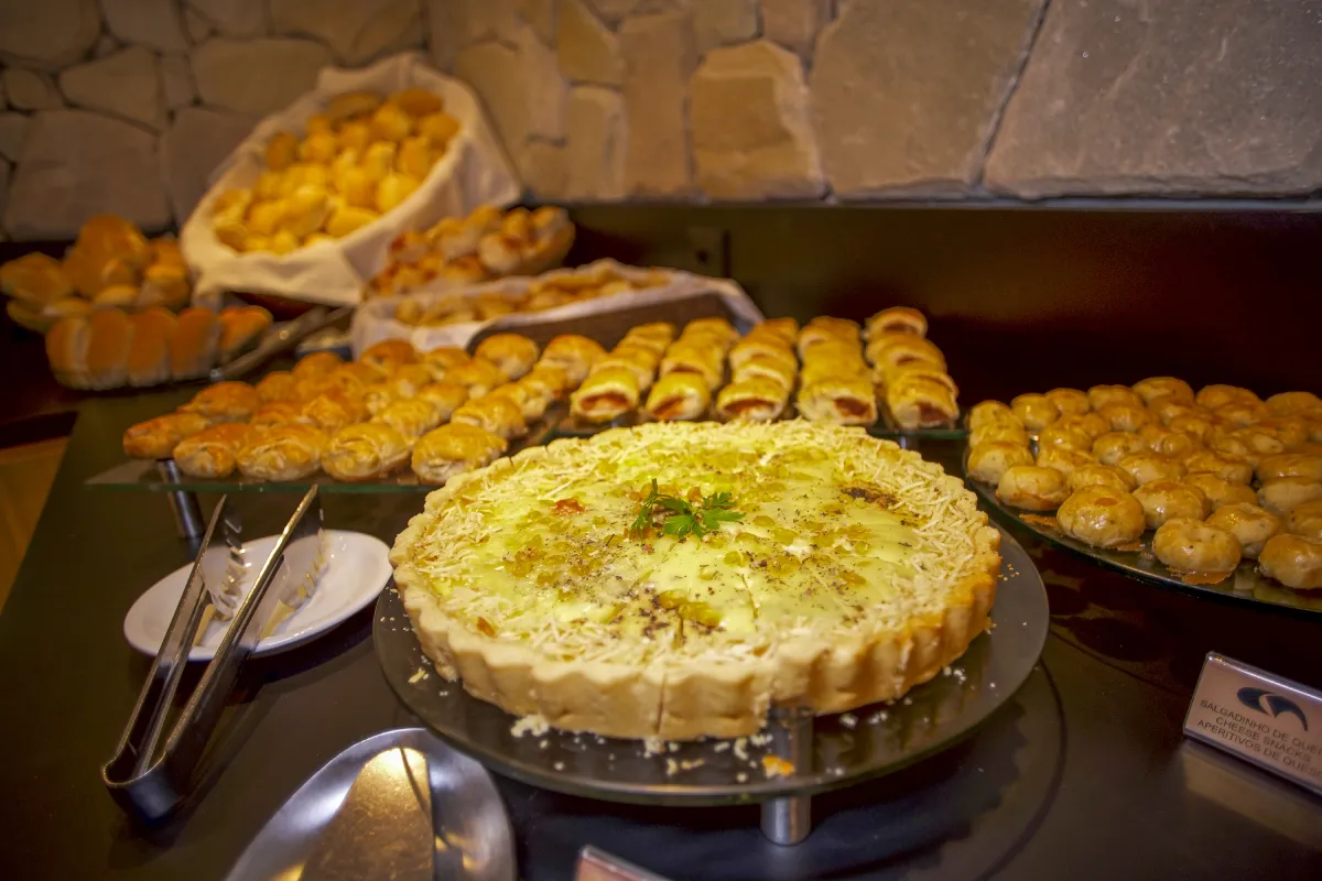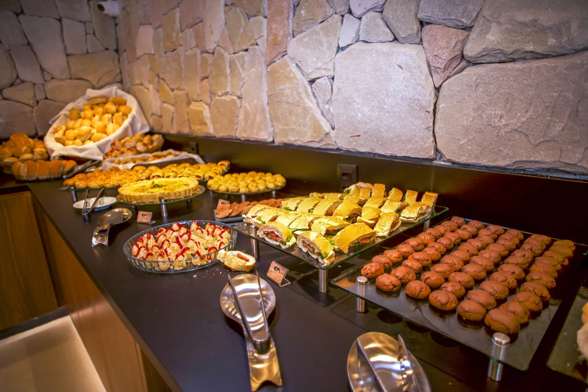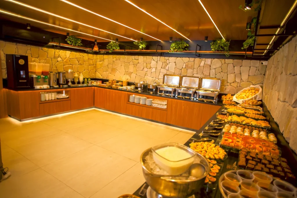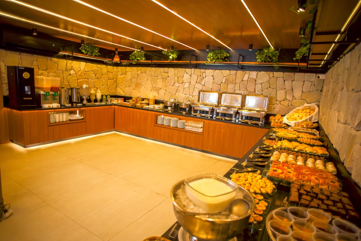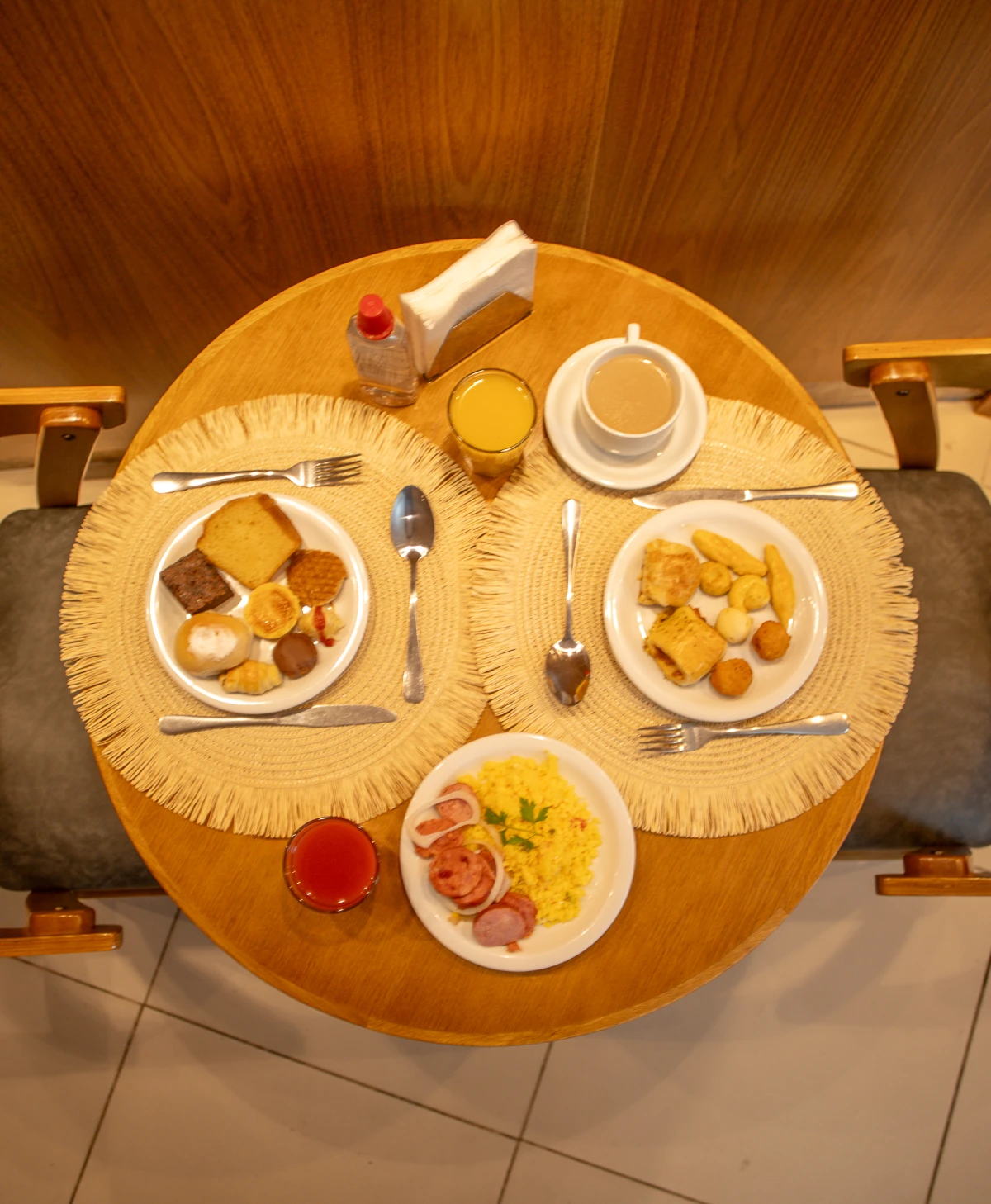 Servido em estilo buffet, o café é farto e saboroso, com pães variados, frutas frescas, bolos, frios, sucos naturais, além de opções regionais como cuscuz, tapioca e outras delícias da culinária potiguar.
