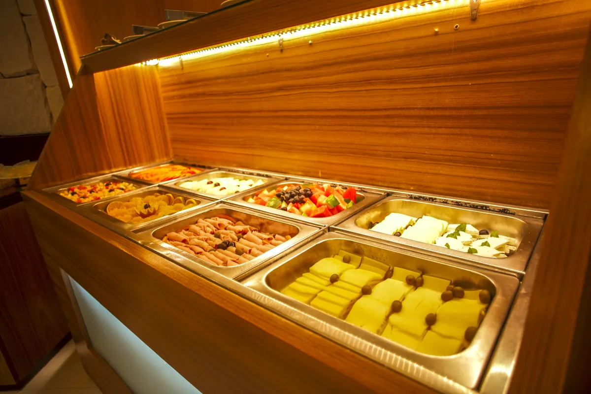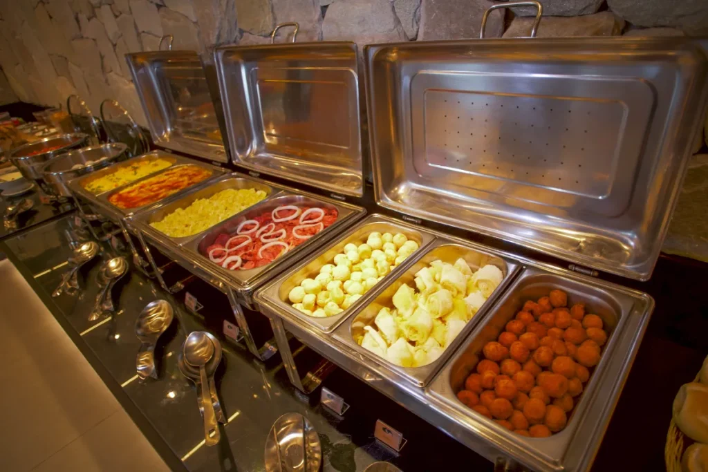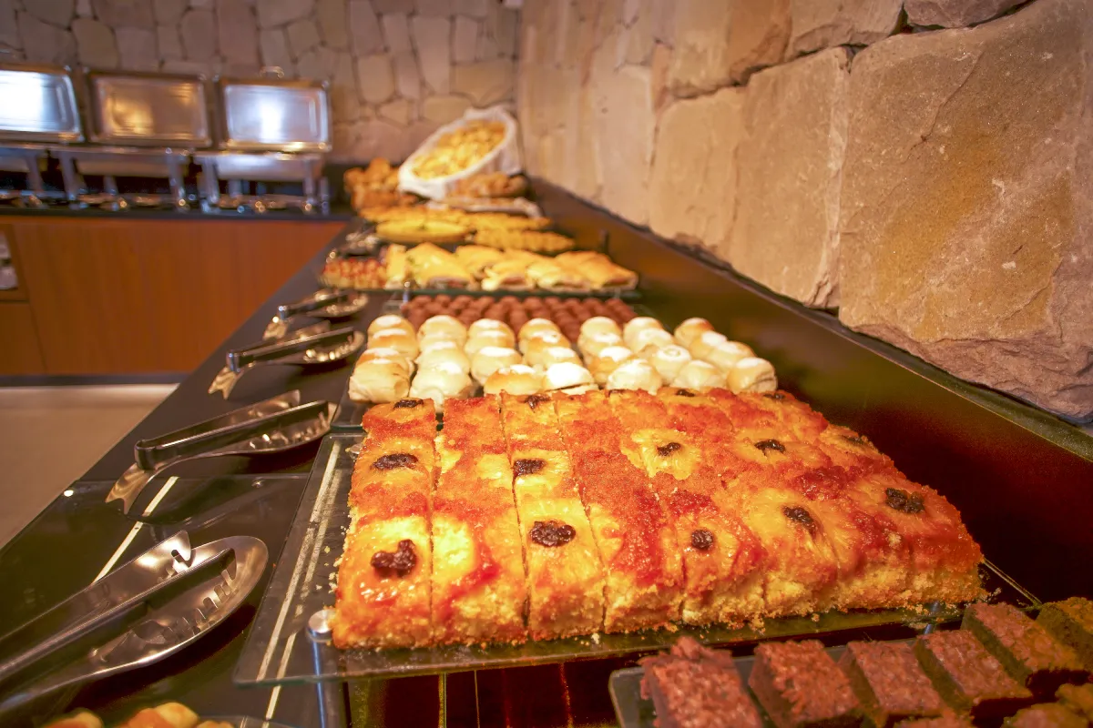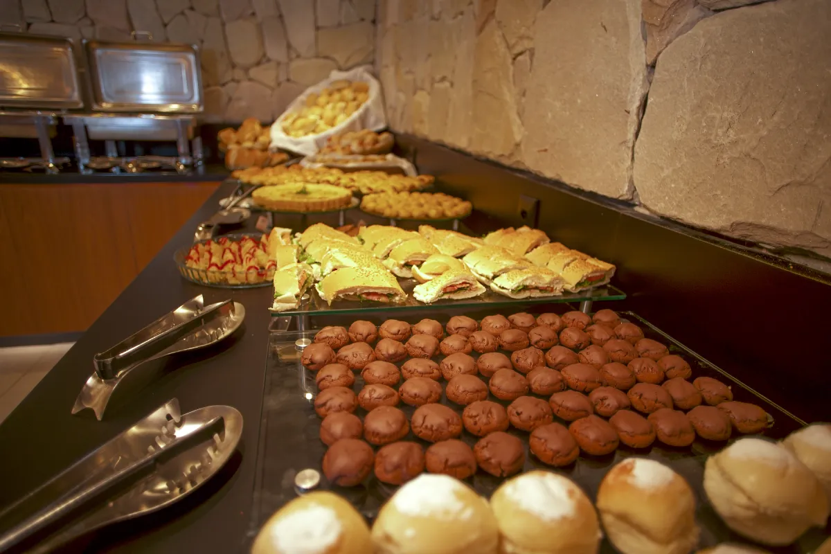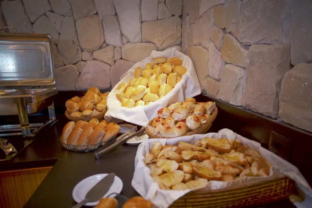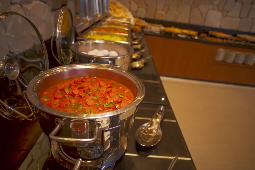 Servido em estilo buffet, o café é farto e saboroso, com pães variados, frutas frescas, bolos, frios, sucos naturais, além de opções regionais como cuscuz, tapioca e outras delícias da culinária potiguar.
