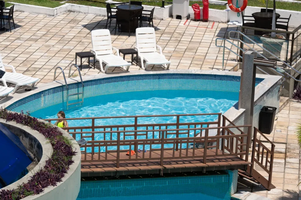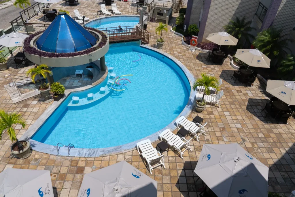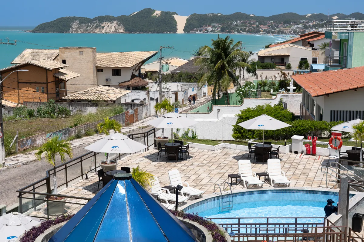 A área de lazer do Hotel Costa do Atlântico conta com piscina adulto e infantil, além de bar molhado com petiscos e bebidas, espreguiçadeiras, guarda-sóis e uma bela vista para o mar de Ponta Negra e o Morro do Careca.